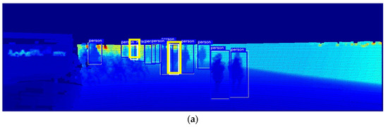 Here, and are the eigenvalues of the camera, representing the focal lengths in the horizontal and vertical directions, respectively; and denote the principal points of the 2D image; and and denote the rotational transformation and parallel translation matrices, respectively. They are computed using singular value decomposition as described in [22]. Consequently, a depth map, aligning with the camera’s viewpoint, is created and employed for training YOLO. Figure 2 depicts the process of creating a depth map by aligning a LiDAR-acquired PCD point with a camera. Figure 2a presents an image acquired by an RGB camera, while Figure 2b displays a point map projected onto the image by aligning the 2D-transformed PCD with the camera. Moreover, Figure 2c illustrates the resulting depth map.
