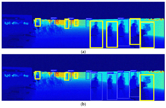 Figure 5 shows an example of pedestrian detection results in daylight, i.e., when the brightness level is 100%. In the figure, the white bounding box indicates the ground truth, the blue box indicates a successful pedestrian detection, and the thick yellow box indicates a missed detection. Figure 5a shows the result of detecting pedestrians using only the depth map obtained from LiDAR, while Figure 5b shows the result of fusing LiDAR with an RGB camera to detect pedestrians. Figure 5c–f show the detection results of the Maragos and Pessoa [12] model, which sequentially accentuates the contours of objects with the Dilation filter; the Deng [13] model, which emphasizes the density of objects with the unsharp mask filter; the Ali and Clausi [14] model applied with the Canny edge filter; and the proposed model, respectively. As can be seen, when the illumination was sufficiently high, both existing models with similar architectures detected most of the objects except for one or two, and no substantial difference was observed in their performance. However, a closer inspection reveals that the proposed model distinctly identifies a pedestrian located centrally in the scene, which is overlooked by all other methods. The proposed model’s superior reconstruction quality facilitates more accurate detection.
