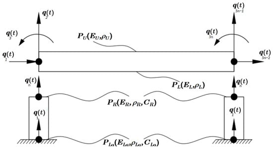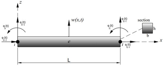 The degrees of freedom for a two-node finite element beam model with a total length of L are shown in Figure 3. It is assumed that the elastic modulus E, density ρ and Poisson’s ratio ν of the beam are constant.