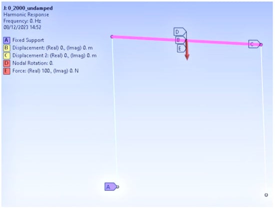 The finite element model is also created with 3-D truss and beam elements in ANSYS to compare and visualise the results. To better understand the effect of the bar and beam on the vibration response, simulations are performed in the ANSYS environment. Three-dimensional truss and beam elements are connected with revolute joints. The system is fixed at the ends of aluminium bars. In addition, out-plane nodal rotation and displacements of the system are fixed to obtain in-plane motion (Figure 6). In the Ansys model, 64 elements are used for each of the beams and bars as in the Matlab model. The bars and beam have a rectangular cross-section with a width of 100 mm and a height of 10 mm. Their length is 1000 mm.
