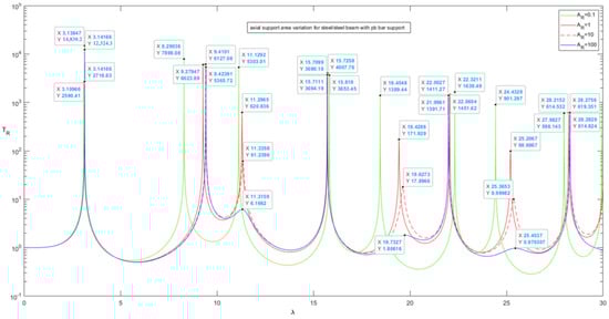 No study has been found in the literature on the vibration of viscoelastic FG bar-supported beams subjected to a harmonic force at the centre point. Therefore, the frequency parameters of the simply supported beam [] are used to verify the simulation results. The simply supported boundary condition is obtained by making the bar supports rigid. The value of Young’s modulus E of beam is 2.1 × 1011 N/m2 for the steel beam. Infinite axial stiffness can be simulated by setting the values of ELa and ER equal to 70 × 1080 N/m2 and na = 1 for the axial bars. Figure 5 shows the force transmissibility of a steel beam supported with rigid bars, obtained in a MATLAB environment. The scanning interval is taken as 10−8 Hz when calculating the frequency parameters in all the tables for the harmonic analysis of the system in MATLAB. Considering the simulation time in graphical representations, the scanning interval for harmonic analysis in MATLAB is assumed to be 0.01 Hz. Consequently, the calculated results are compared with the exact results of the simply supported isotropic steel beam in Table 2. The exact results are obtained using Rao’s analytical values [].