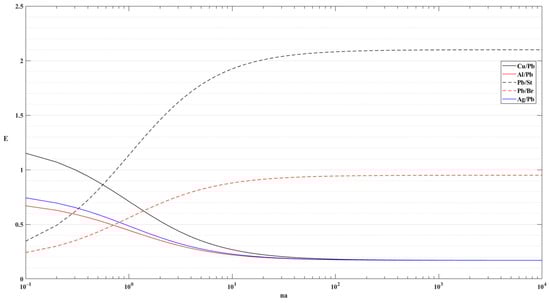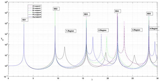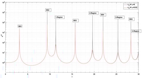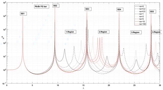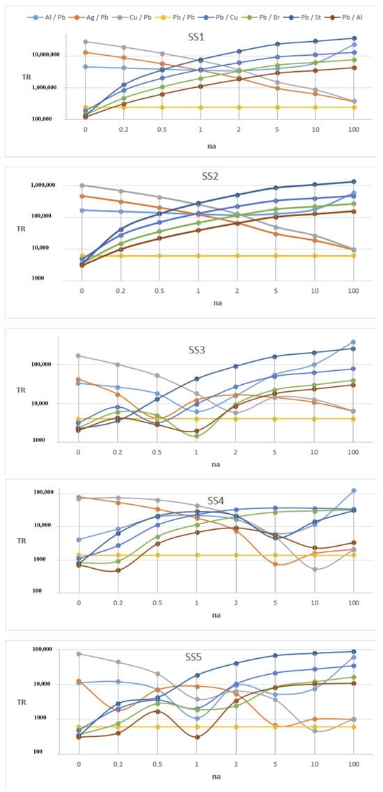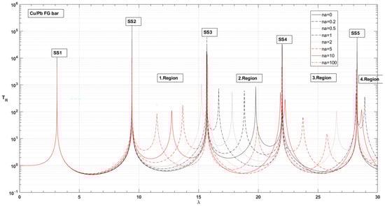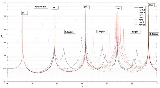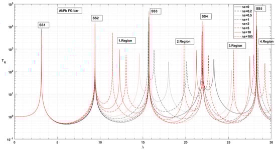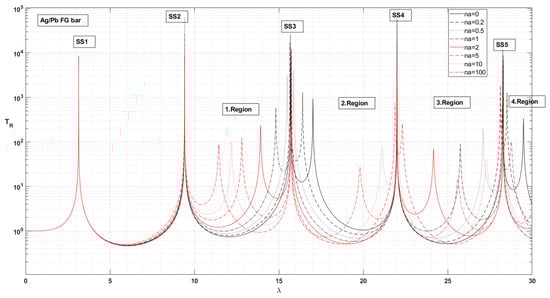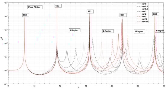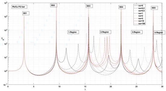 - For the SS frequency parameters of the system with the Ag/Pb and Cu/Pb material pairs under the condition of cAratio < 1, the TR values are maximum for na = 0, while the TR values are minimum for na = 100. Although there are exceptional cases, the general trend is in this direction. In contrast to the other material pairs with cAratio < 1, for the SS frequency parameters of the system with the Al/Pb material pair, the TR values are maximum for na = 100, while the TR values are minimum for na = 0 and the various na values (Table 6, Figure 20).