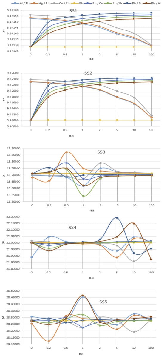 - Since it is possible to influence the elasticity and mass distribution with na, isolation in the form of a dynamic absorber will be possible for the relevant frequency. While the peak value is minimised at a certain frequency, the frequency is decomposed as two different peak values. This may be a different approach to the study of minimising the vibration made by Mi and Song []. As an example of this situation, Figure 13, Figure 15, Figure 17 and Figure 18 show that for the material pair Al/Pb, SS3 and SS5 for na = 1; for the material pair Cu/Pb, SS5 for na = 10; for the material pair Pb/Br, SS3 for na = 1; and for the material pair Pb/St, SS4 frequency can be given as na = 5.