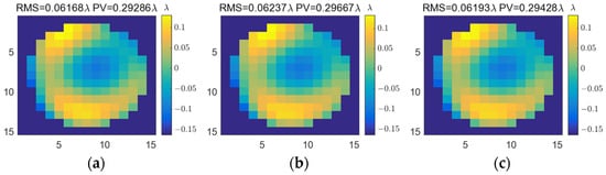 From Figure 5, it can be seen that the RMS values of the residual aberration obtained using the iterative method are all less than one-thousandth of a wavelength after the reconstructed wavefront is subtracted from the known aberration distribution. The RMS value shown in Figure 5c approaches one-ten-thousandth of a wavelength, which demonstrates the accuracy of the iterative method in simulation results. As the array scanning step size decreases, the aberration obtained through the iterative method becomes closer to the known aberration. Stated differently, reducing the step size enhances the accuracy of the iterative method and reduces the number of iterations needed for convergence. This is attributed to the fact that a smaller scanning step size brings adjacent measurement positions of the multi-beam array closer, resulting in a denser sampling of beams. As a consequence, more data are collected, and a larger dataset implies more accurate fitting results for Equations (5) and (6). Additionally, the averaging method proposed in reference [] assumes the wavefront in the optical system is uniformly sampled by an individual beam. It calculates the average of a large amount of multi-beam pointing error data based on statistical principles to eliminate sub-aperture aberration signals. But, a larger reconstruction error will be induced. The residuals after subtracting the reconstructed wavefront distribution using the averaging method from the preset aberrations are shown in Figure 6.