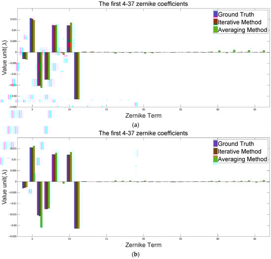 Under the same conditions, the residuals of the iterative method are significantly smaller than those of the averaging method, as shown in Figure 6. Figure 7 illustrates the comparison among the ground truth of aberration, the result using the iterative method, and the result using the averaging method with the coefficients of Zernike polynomial.