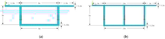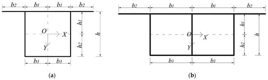 Under vertical symmetrical loading, the bending shear flow significantly influences the normal stress distribution []. Therefore, the distribution pattern of the shear flow in single- and double-cell box girders was investigated in this work. Figure 1 displays simplified thin-walled box cross sections that consist of one top plate of width 2b1, two cantilever plates of width b2, one bottom plate of width 2b3, and several webs of height h.