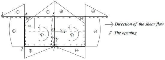 where x0 is the distance from the zero point of the shear flow to the side web in the opened double-cell section; tw1 and tw2 represent the thickness of the middle web and the side web, respectively. After assigning the additional static shear flow q1 and q2 for the two cells, the conditions of deformation compatibility are described as follows: