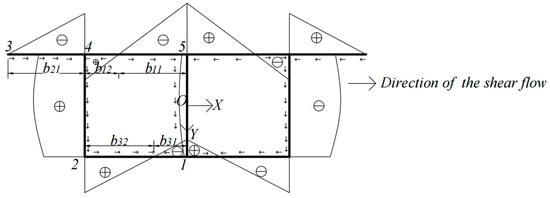 Eventually, the total shear flow distribution in the closed double-cell box section can be obtained, as shown in Figure 4. The top and bottom plates exhibit a positive and negative alternating phenomenon in this distribution. It can be found that the zero points of the shear flow are not situated at the center axis of each cell but at a specific location. According to the zero points of the shear flow, the top plate is divided into two parts, the lengths of which are b11 and b12, and the bottom plate is divided into two parts with b31 and b32 lengths, respectively. Additionally, the distance from the zero point of the shear flow located at the free end of the cantilever plate to the side web is b21. The above distances can be obtained as follows: