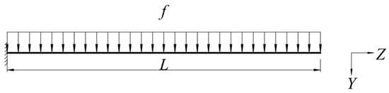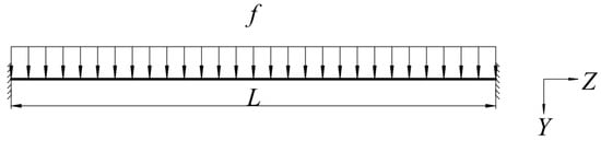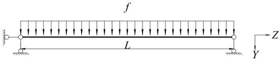 As depicted in Figure 7, the uniformly distributed load f is applied to the simply supported beam. The analytical solutions of this system are described as follows:
