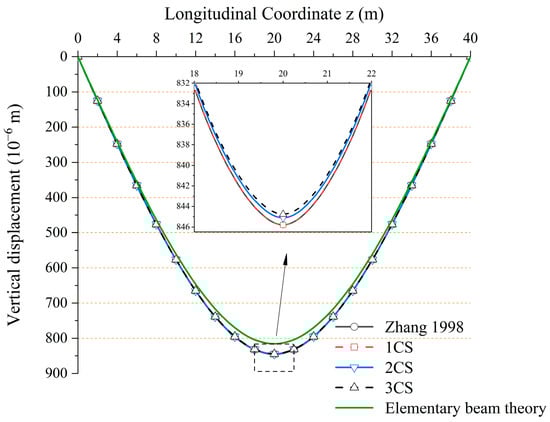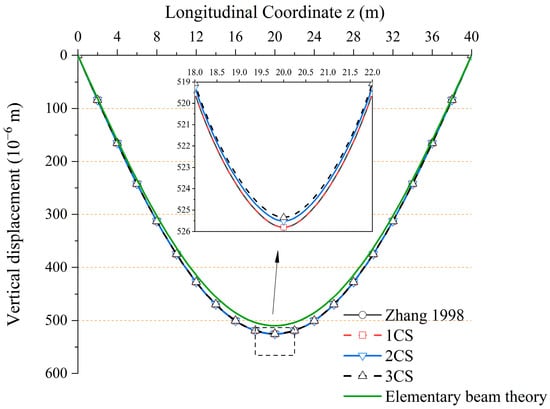 Reissner [] was the first to adopt the variational energy method to study the shear lag effect and established a quadratic parabolic model to describe the normal stress distributions of rectangular box beams. However, other scholars discovered that the shear lag warping displacement function with a cubic parabola was more suitable for analyzing the shear lag effect of box girders [,,]. Combining the above two models, Hu [] and Yu [] proposed that the warping displacement function of top plates was a quadratic parabola, while the warping displacement function of cantilever plates was a cubic parabola. In addition, cosine function models were also used to address the shear lag effect problem []. An additional term was introduced to the cosine function model to ensure the axial equilibrium of the single-cell box section [], which improved the accuracy and preciseness of shear lag analysis. Zhang [] then defined two global modification factors that prevented the generation of additional axial force and bending moment caused by shear lag warping stresses, successfully capturing the self-balancing characteristic of the system. Additionally, the web’s longitudinal displacement was added to satisfy axial equilibrium conditions, and independent shear lag warping displacement functions were employed in different flanges [,]. Zhu [] also considered axial force balance when formulating the shear lag displacement model of the single-cell box girders and pointed out that considering axial force balance yields more precise results.