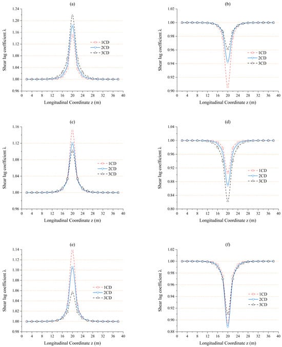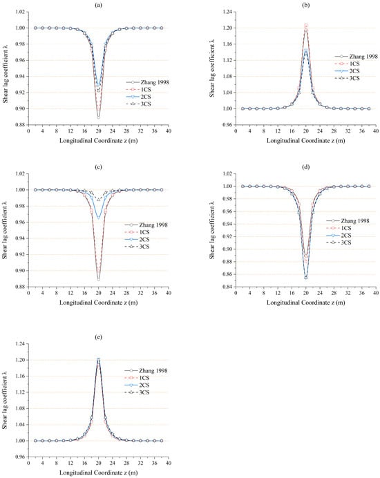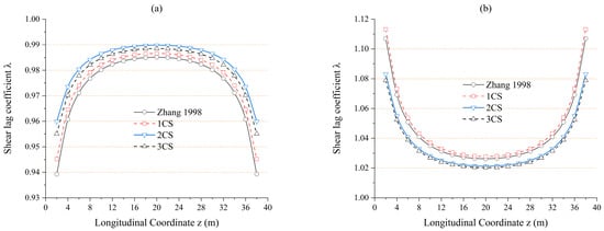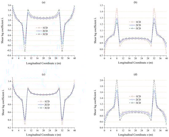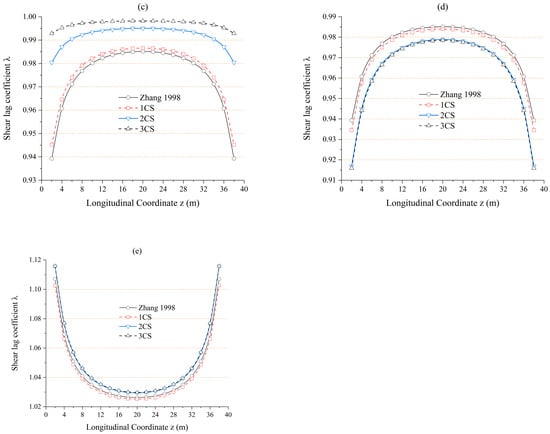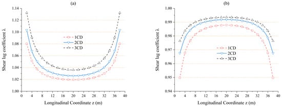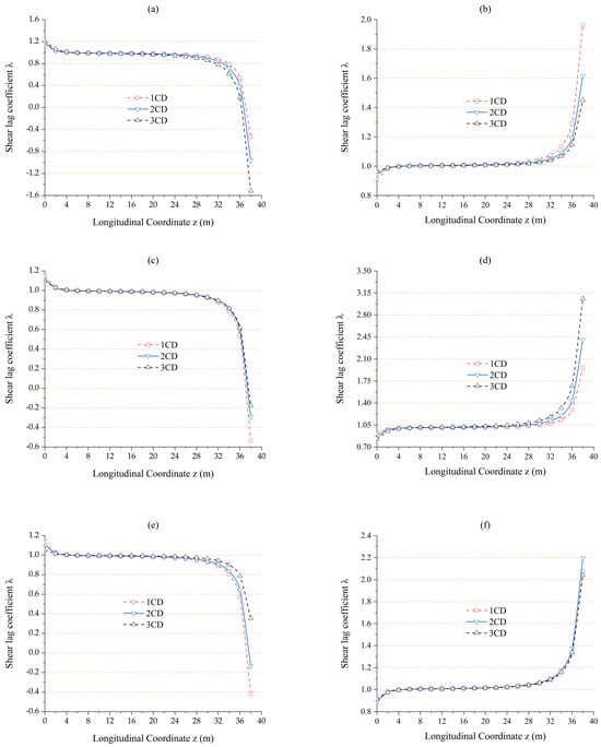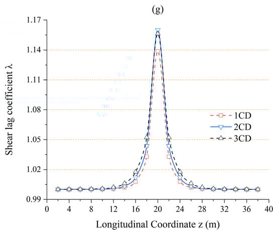 As an essential indicator of the shear lag effect, the shear lag coefficient λ represents the relative relationship between the stress considering the shear lag effect and the stress derived by the elementary beam theory. The shear lag coefficient can be defined as follows: