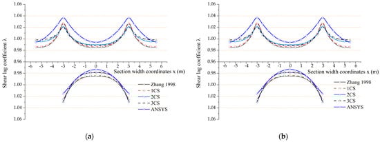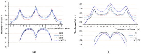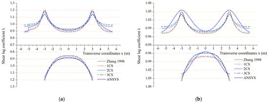Transverse distributions of shear lag coefficients of Example 6: (a) z = 2 m; (b) z = 20 m.