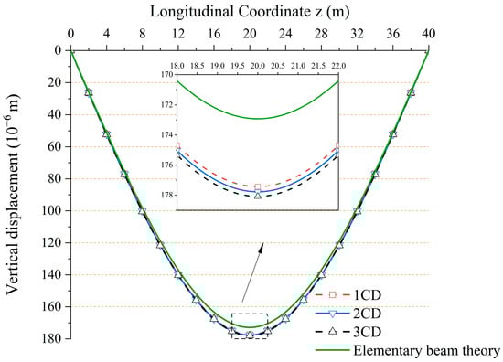 Some assumptions are reasonably introduced before constructing displacement function models: (1) the neutral axis of thin-walled box beam sections remains constant under bending stresses; (2) the box girders are in the linear elastic stage, and the shear deformation out of the plane is neglected; and (3) the shear lag effect only alters the normal stress distribution in the cross section, with no effect on the distribution of internal forces along the beam’s longitudinal direction [].