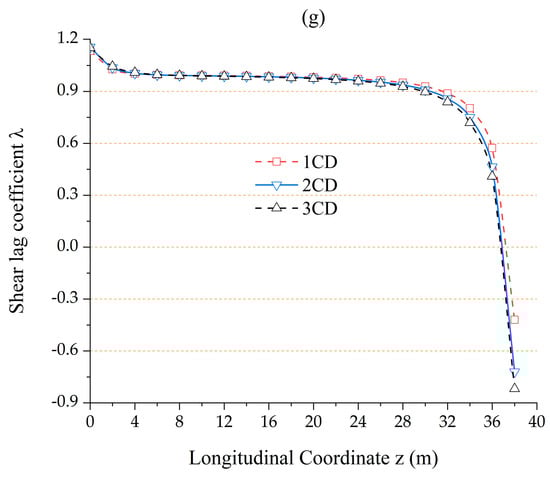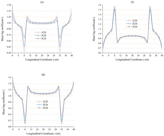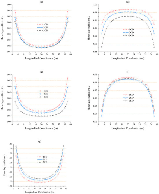 Longitudinal distributions of shear lag coefficients of Example 6: (a) λ(a21) (top plate at x = 0 m); (b) λ(a22) (top plate at x = b11 m); (c) λ(a23) (top plate at x = 5 m); (d) λ(a24) (cantilever plate at x = 8 m); (e) λ(a25) (bottom plate at x = 0 m); (f) λ(a26) (bottom plate at x = b31 m); (g) λ(a27) (bottom plate at x = 5 m).
