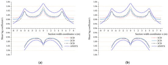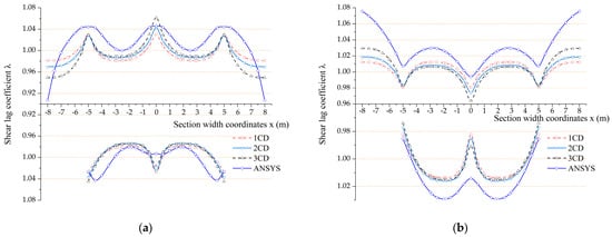 where σ0 is the stress calculated by the primary beam theory and σ1 is the stress caused by the shear lag. In addition, the phenomenon that λ is has a value greater than one at the web and less than one at the flanges’ interior is called the positive shear lag effect, the opposite of which is the negative shear lag effect [].
