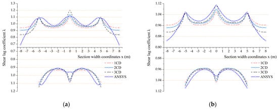 (1) The proposed method can provide reasonable predictions for the shear lag effect of single- and double-cell box girders. It is suggested that the 2CS method is suited for solving the shear lag effect in single-cell box girders, and the 3CD method is recommended for double-cell box girders. The analytical methods based on the shear flow distribution law proposed in this paper are more straightforward and practical. They also provide theoretical support for the subsequent development of finite beam elements.