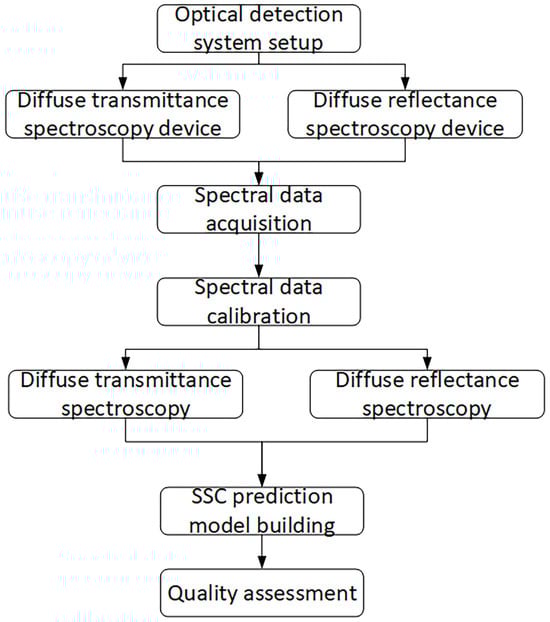 Traditional SSC measurement involves extracting fruit juice and determining its refractive index with a refractometer []. Although straightforward, this approach is time-consuming, destructive to the samples, and requires significant manual handling. Moreover, the refractometer cannot directly assess solid samples, necessitating juice extraction for each measurement. Additionally, the need to clean the instrument after each use prolongs the process and increases the likelihood of human error. In recent years, non-destructive detection technologies, such as machine vision [], spectral analysis [], and electronic nose technology [], have been widely used in food and agricultural product testing. Machine vision can only reflect the appearance information of the sample and is suitable for coarse grading. The electronic nose system, which uses sensors and algorithms for detection, is expensive and large, limiting its on-site application. Spectral analysis, which can generally collect surface layer (10–20 mm) spectra of samples to obtain chemical composition, offers rapid, accurate, non-destructive, portable, and cost-effective advantages and has been extensively used for agricultural product quality detection []. Compared with refractometers, machine vision, spectroscopy, and electronic nose technologies offer distinct advantages for non-destructive testing. Machine vision excels at detecting external appearance, while spectroscopy provides rapid, accurate, and non-invasive measurements of surface spectral information to estimate SSC and other quality parameters. The electronic nose is highly sensitive to volatile compounds, though its high cost and large size limit its field applications. These advanced technologies address the refractometer limitations of being time-consuming, destructive to samples, and labor-intensive.