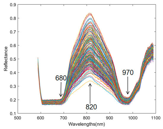 As shown in Figure 9, significant noise was evident at both the beginnings and ends of the spectra. This noise was primarily attributable to the characteristics of the light source and detector. In the short- and long-wavelength regions, the intensity of the light source was often lower, and the detector sensitivity in these ranges was also reduced, resulting in a lower signal-to-noise ratio and increased noise. Additionally, the response of the spectrometer might be uneven across different wavelength ranges, particularly at the edges of the spectrum, where the instrument response is weaker and more susceptible to noise. To enhance the effectiveness of spectral modeling, it was recommended to exclude spectral data affected by noise during the data modeling process. For the reflectance spectra of kiwifruit, a significant absorption peak was observed at 680 nm, likely due to the strong absorption characteristics of chlorophyll at this wavelength. Additionally, a smaller absorption peak around 720 to 750 nm might be associated with the fourth overtone vibration of C-H bonds.