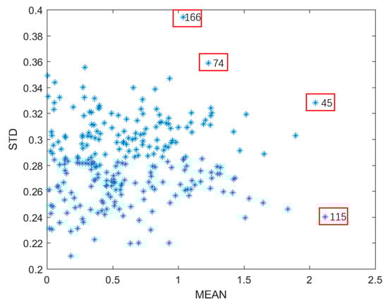 When conducting data analysis, removing outliers is essential to ensure the accuracy of model development. In this study, the MC outlier detection method was employed as a crucial step for this purpose. This method effectively identifies various types of outliers, including those in both (X) and (Y) datasets. MC outlier detection involves multiple rounds of random sampling and statistical analysis to pinpoint data points that significantly deviate from other samples. The method utilizes a large number of simulations to assess each data point performance, determining its status as an outlier based on the distribution of the mean and standard deviation. In this study, the MC outlier detection method was applied to the collected spectral data and SSC measurements. As illustrated in Figure 5, this approach identified samples with unusually high means and standard deviations as outliers. Consequently, the samples labeled 45, 74, 115, and 166 were removed based on the results of the outlier detection.