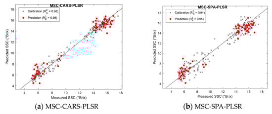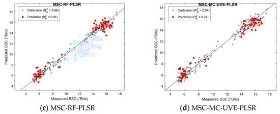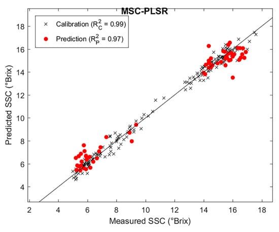 As shown in Table 3, the model using raw data also exhibited high  values, and the performance of the PLSR models was significantly influenced by the different spectral preprocessing methods. Among these, MSC preprocessing demonstrated the best performance, with an R2 of 0.99 for the calibration set and 0.97 for the prediction set, as well as the lowest RMSEC (0.38 °Brix) and RMSEP (0.80 °Brix). Although normalization and SG preprocessing reduced the number of latent variables, their performance did not surpass that of MSC. Overall, MSC was identified as the most effective preprocessing method, improving both model fitting and prediction accuracy. The modeling effect after MSC preprocessing is shown in Figure 6.