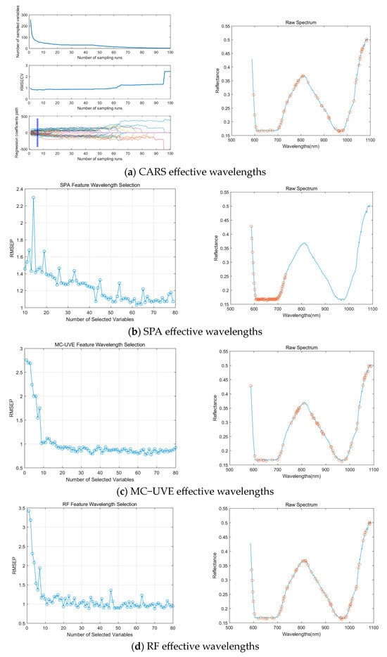 Effective wavelengths selection played a crucial role in reducing the dimensionality of spectral data by choosing only the wavelengths with significant and important features, thereby enhancing the efficiency and accuracy of the predictive model construction []. By selecting wavelengths that were highly correlated with the target characteristics, irrelevant information variables were eliminated, which helped to avoid overfitting and spectral overlap. This improved the generalization capability and stability of the predictive model.