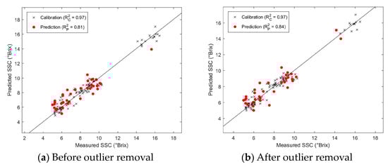 Prediction of kiwi SSC using diffuse reflectance PLSR model before and after outlier removal.