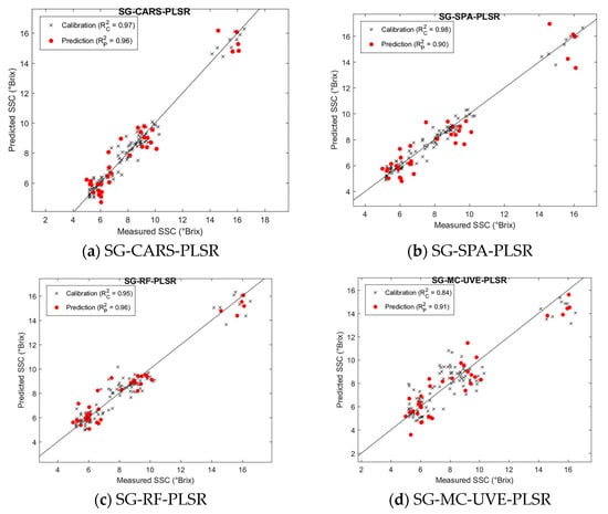 To further enhance model performance, the CARS method was employed for feature wavelength selection. As detailed in Table 12, the optimized model exhibited significant improvements. The coefficients of determination increased to  = 0.98 for the calibration set and  = 0.98 for the prediction set. Additionally, the RMSE values were notably reduced, with RMSEC decreasing to 0.40 °Brix and RMSEP to 0.66 °Brix.