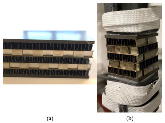 In this work, a sandwich structure representing the inner core of an aircraft heat exchanger was studied. It consists of a periodically brazed structure comprising plates and fins. The plates have a thickness of 0.5 mm, while the fins range from 0.05 to 0.25 mm. To withstand internal pressure and enhance the heat transfer surface area, the fins are rectangular in shape. These heat exchangers must endure high temperatures and pressures and cyclic thermal stresses resulting from temperature variations during operation. Materials with high temperature resistance and excellent corrosion performance, such as Ni alloys and stainless steels, are employed in the manufacturing of heat exchangers. A critical stage in their production is the brazing of plates and fins. Due to the presence of a large number of fin-plate joints in a conventional heat exchanger, ensuring the strength and reliability of these joints is essential [,,,]. Considerable efforts have been directed towards detecting and identifying defects in these brazed joints, as they play a critical role in ensuring the proper performance of heat exchangers during operation [,].