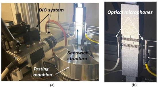 This figure shows the set-up (a) with the sandwich structure clamped in the testing machine and the non-destructive systems installed. In subfigure (b), two microphones are positioned at the sides of the heat exchanger.