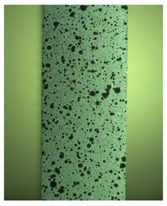 A random pattern must be created on the sample so that consecutive images are correlated. In this particular case, two different sprays were used. First, the entire gauge length was painted with a white spray, and then black droplets were sprayed to achieve a stochastic pattern, as illustrated in Figure 3 for a flat surface (shown as an example). Once the pattern was applied, the sample was secured in the testing machine to conduct the fatigue test and capture a sequence of images at 20 frames per second.