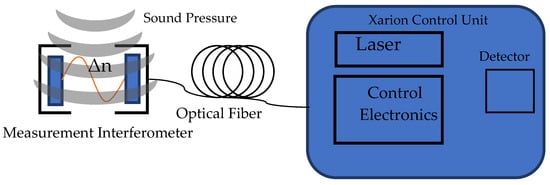 The measurement principle of these membrane-free optical microphones is based on a Fabry–Pérot laser interferometer. In general, acoustic waves represent local pressure changes of the traversed medium, which, in this case, is air. These pressure changes induce variations of the refractive index in the air. The Fabry–Pérot interferometer, located in the sensor head of the optical microphone, can measure these alterations of the refractive index and convert them into to corresponding sound pressure changes. This method enables the acquisition of acoustic signals with a bandwidth of up to several MHz in air. The general design of the optical microphone comprises a compact sensor head (as depicted in Figure 4), housing the interferometer, and a signal conditioning unit (SCU) that incorporates the laser and all the electronics for signal processing. Throughout this testing campaign, the signals were recorded with a sampling frequency of 3 MHz.