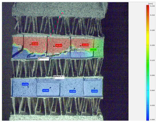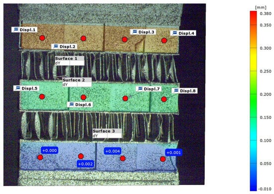 The analysis of the images relied on a commercial Image Correlation algorithm using GOM correlate software (2019 version, free trial). Given the uniaxial loading conditions, the displacement field in the longitudinal direction was used as the main magnitude. It is important to note that due to the geometric nature of the sandwich structure, only the side face of the fins can be monitored, given their thickness (100 um). As a result, no stochastic pattern could be applied and observed in such a tiny surface. Therefore, only the side face of the fins was monitored, as illustrated in the next image (Figure 5). This image depicts the longitudinal displacement in the axial direction, where load was applied, along with the corresponding values. The final computed magnitude is strain, obtained by using the following formula: