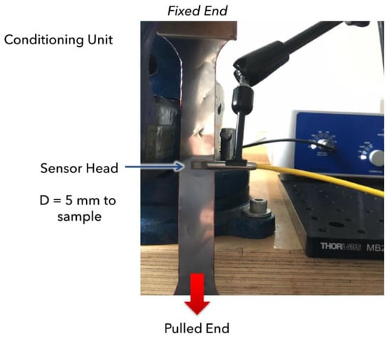 Regarding the optical microphone, a proof of concept was conducted before commencing the fatigue tests. This was done to properly evaluate the best mounting configuration of the sensor heads and calibrate the settings of the signal conditioning unit (SCU) for this application. During this procedure, a tensile test was performed with the sensor heads of the microphones placed at 5 mm from the sample to effectively capture any potential small cracks (refer to Figure 6).