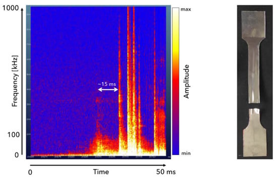 In the illustrated spectrogram (Figure 7), several noteworthy aspects can be highlighted. The graph represents a 50 ms duration test, where initially, no signals are observed except for the low frequency background noise. Towards the end of the test, numerous high-amplitude and high-frequency events became evident, likely associated with the phenomenon of metallic sheet rupture. Of particular interest was a smaller peak observed 15 ms prior to rupture, possibly linked to a small crack that did not lead to rupture. This aspect is crucial as, in practical applications, the identification of small cracks is more important than complete ruptures. Additionally, the released energy is proportional to the area of the break. Obviously, the thinner the sample (as in this case), the lower the signal. Despite that, signal was clearly captured proving the concept.
