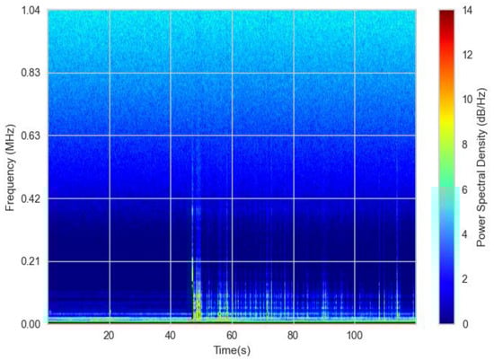 To analyze them, a spectrogram was calculated. A spectrogram is a three-dimensional representation showing the spectral acoustic energy of the signal over time and frequency. In its calculation, the time signal of the acoustic process emissions was split into overlapping segments and a Fourier transformation was applied to each segment. The result is presented in Figure 7, where time is represented on the horizontal axis, frequency on the vertical axis, and the respective acoustic energy amplitude is depicted as color.
