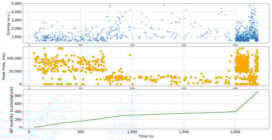 - The root mean square of the signal was computed to determine the energy of the acoustic events. From these values, high-energy events were identified and distinguished from the low ones.