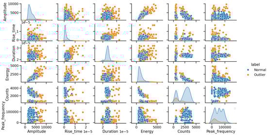 All these events that appeared during the 2200 s of the fatigue test were analyzed following the procedure explained in Section 2.3. A total of 910 events were identified, and machine learning-based classification was performed using the Isolation Forest Algorithm. Results are visualized in pair plots created with the Seaborn library in Python (see Figure 10). In the graph below, outliers are marked in orange while blue marks represent standard events. The features that most distinguish outliers from the rest according to the study are amplitude, rise time, duration, and energy, that is, time domain features. Conversely, no apparent differences between the two classes are observed in relation to the number of counts and peak frequency. Higher frequencies would be expected from cracking events (assuming that outliers are cracking events). For instance, some authors identified peak frequency as the main relevant feature for classifying different cracking mechanisms during corrosion phenomena [] or compression tests []. This finding aligns well with the observations in Figure 9, where regions associated with higher damage level contain the highest peak frequency events. Others have determined that frequencies above 350 kHz are strongly correlated with crack counts in some industrial processes like cladding [].