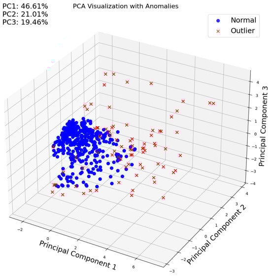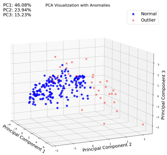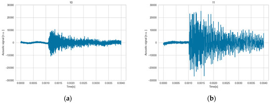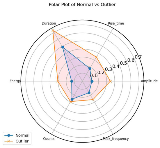 When the machine learning-based classification is represented using Principal Component Analysis (PCA), it is observed that the main three components explain 80% of the variability and the two classes (red—outliers and blue—normal or standard signal) are clearly distinguishable (Figure 11). This indicates that both types of signals can be effectively differentiated. As an example, in the following figure (Figure 12), a representative sample of each signal is shown. Outliers (image on the right side) exhibit higher amplitude signals with greater energy, rise time, and duration compared to the other signals (image on the left side). This indicates that the machine learning algorithm is capturing the primary variability which is related to different amplitude signals. However, it is important to note that cracking aspects are better defined by frequency domain features, such as the peak frequency (as observed in Figure 9), rather than amplitude- and energy-related features.