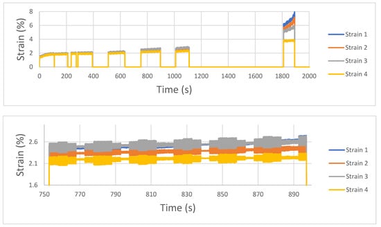 Four different locations strain along the whole tests. Signal discontinuities represent sequences that were not analyzed due to the high number of images.