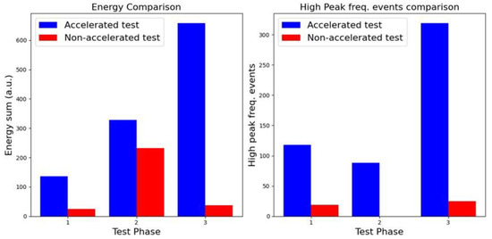 Comparison between accelerated and non-accelerated tests in terms of energy and number of high-peak-frequency events.