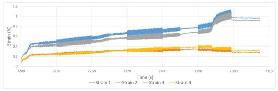 In the case of the strain evolution from DIC system, the level remained constant until the last stages of the tests, where a clearly noticeable redistribution was observed. In this particular case, Figure 18, strain 4’s level was kept at a lower level while strain 1 and strain 2’s levels increased dramatically until rupture. This again indicates that failure occurred at the left side of the sandwich structure. Similar to the accelerated test, the strain redistribution was captured later (from second 7000 on, 70,000 cycles) than the capture of the first initiation symptoms by acoustic signals, which were captured from the 500 s onwards (5000 cycles). According to these results, DIC captured the most severe phase (phase 3) which started after 70,000 cycles.
