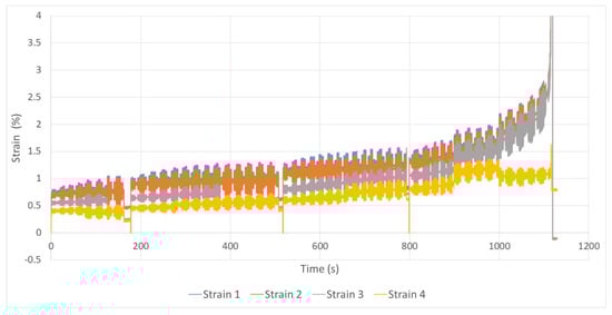 where L is the distance between the surface’s centre. This formula was similarly applied to Displ.2–Displ.6, Displ.3–Disp.7, and Displ.4–Displ.8, respectively. This approach assessed the strain between two consecutive layers and at different locations. Under perfect uniaxial conditions, all the strain values should have been equal. This remains true during most parts of the test until local ruptures appear. For early damage identification, this approach proved valid, as uniaxial conditions were maintained at this stage.