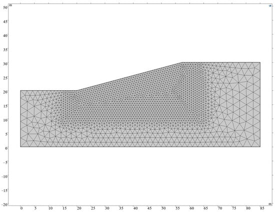 The finite element geometry of the model is shown in Figure 5. For the entire domain under simulation, the Finer option was chosen for the element size, while the Extremely Fine option was selected for the redefinition region. The geometric shape of the finite elements is triangular.