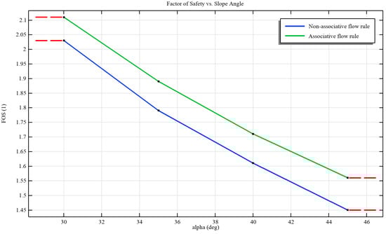 The simulation was run and the Factor of Safety (FoS) was determined for four different slope angles of 30°, 35°, 40°, and 45°. We found that the FoS decreases as the slope angle increases, which was expected, and additionally, the FoS for a similar slope angle is lower for Material 1—non-associative plasticity—compared to Material 2—associative plasticity). These results are graphically shown in Figure 6, and are consistent with those reported in [,].