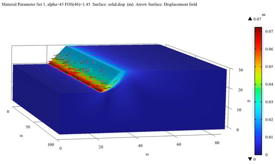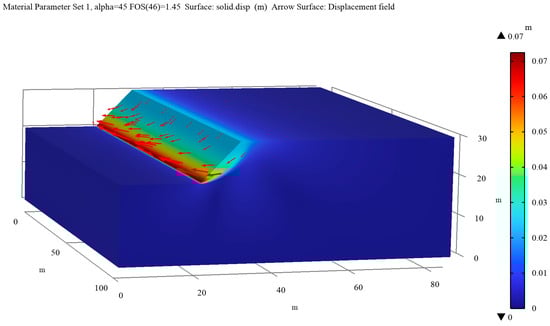 A 3D visualization of the displacement is shown for a slope angle of 45° for both material types in Figure 9 and Figure 10. This slope angle was chosen for the tridimensional presentation as it has the lowest corresponding FoS of 1.45 for the non-associative flow rule and 1.56 for the associative flow rule. The qualitative results are supported by previous research conducted using LEM [,,]. The obtained values also show how parts of the sloped rock mass outside the slip surface begin to slide once the material becomes unstable.