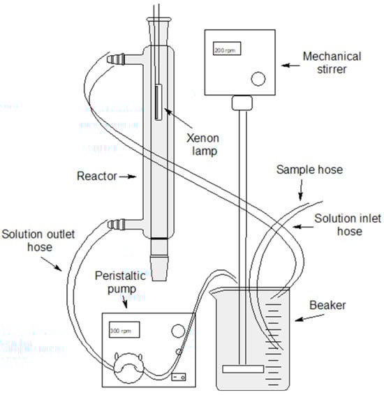 The light source comprised a dark box, a 600 mL continuous-flow glass reactor, a 160-rpm propeller stirrer (DLab OS20-S, Beijing, China), a 1L/min flow rate peristaltic pump (longer pump BT300-2J), and an HI 6500K LED lamp (Figure 1). The photocatalytic tests were performed at room temperature, using a 10-ppm solution of the model pollutant (Figure 2) and a 400-ppm load of the magnetic photocatalyst. The suspensions were stirred in the dark for 40 min to reach the adsorption–desorption equilibrium before starting the irradiation.