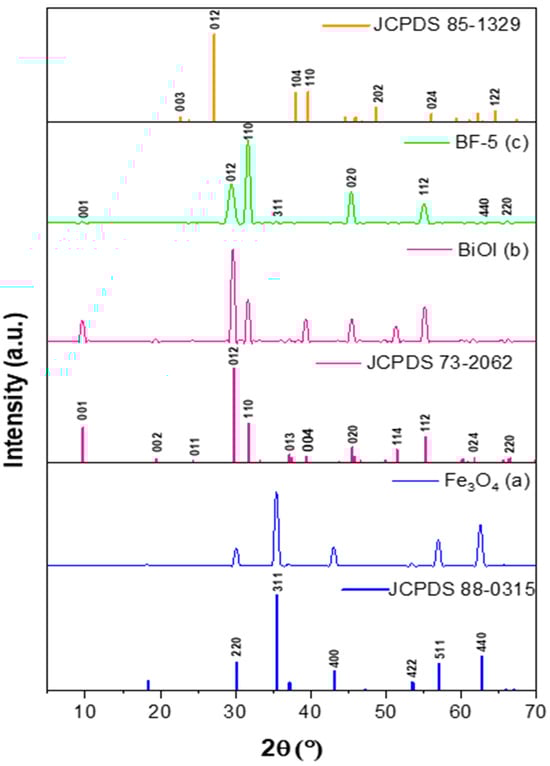 X-ray diffraction patterns of the synthesized materials: (a) Magnetite–Fe3O4, (b) individual BiOI, (c) BiOI/Fe3O4–BF-5.