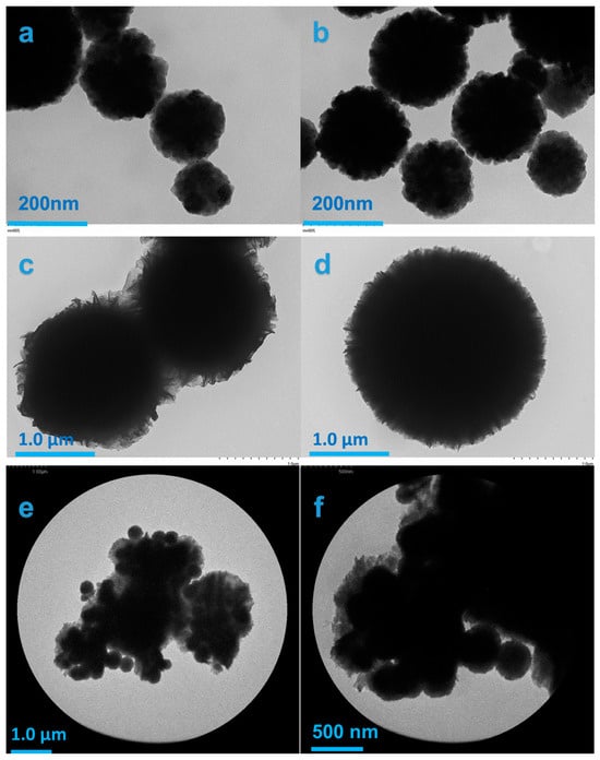 Figure 4 shows the TEM of the obtained materials. Figure 4a,b identify the magnetite; its morphology is constituted by nanospheres, which have a homogeneous distribution and a uniform diameter between 50–200 nm; the size and morphology are similar to magnetite obtained and reported using similar synthesis methodology [,].