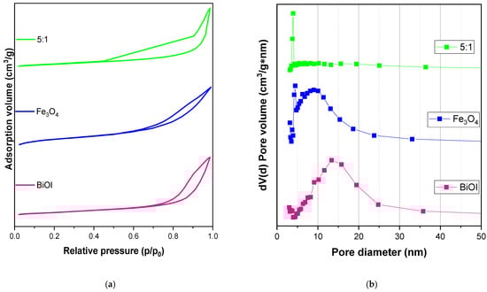 Adsorption/desorption isotherms of N2 were performed to investigate the surface areas and pore size distributions of the obtained materials (Figure 5). The complete BET BiOI and BF-5 isotherm show an IVa-type isotherm with an H3 hysteresis loop, characteristic of mesoporous materials with high adsorption energy []. The Isotherm for Fe3O4 is of an IVa type with an H1 hysteresis loop, suggesting cylindrical uniform pores with monolayer adsorption []. In addition, the pore size graph confirms that the materials are located in the mesoporous range (2–50 nm).