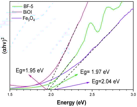 In this equation, α represents the adsorption coefficient, A is the constant of proportionality, h is Planck’s constant, v is the frequency, Eg is the energy band gap, and the exponent n value denotes the electronic transition’s nature. The value of Eg can be obtained by extrapolating the slope of the curve to the x–axis intersection (see Figure 6). The graph (αE) 1/p vs. E can be plotted to obtain the band gap of the straight section of the resulting curve. The point of intersection of the straight line’s extension with the energy axis corresponds to the energy band gap []. For direct gap semiconductors, n is 2, and for indirect gap semiconductors, n is ½ [,]. The band gap of the BF-5 photocatalyst is 1.9797 eV, which allows it to absorb visible light in the solar spectrum region and makes it suitable for solar photocatalysis applications. It should be noted that the synthesis conditions applied in this study do not affect the catalyst band gap in the BiOI/magnetite system since the values of Eg are similar in the materials obtained.